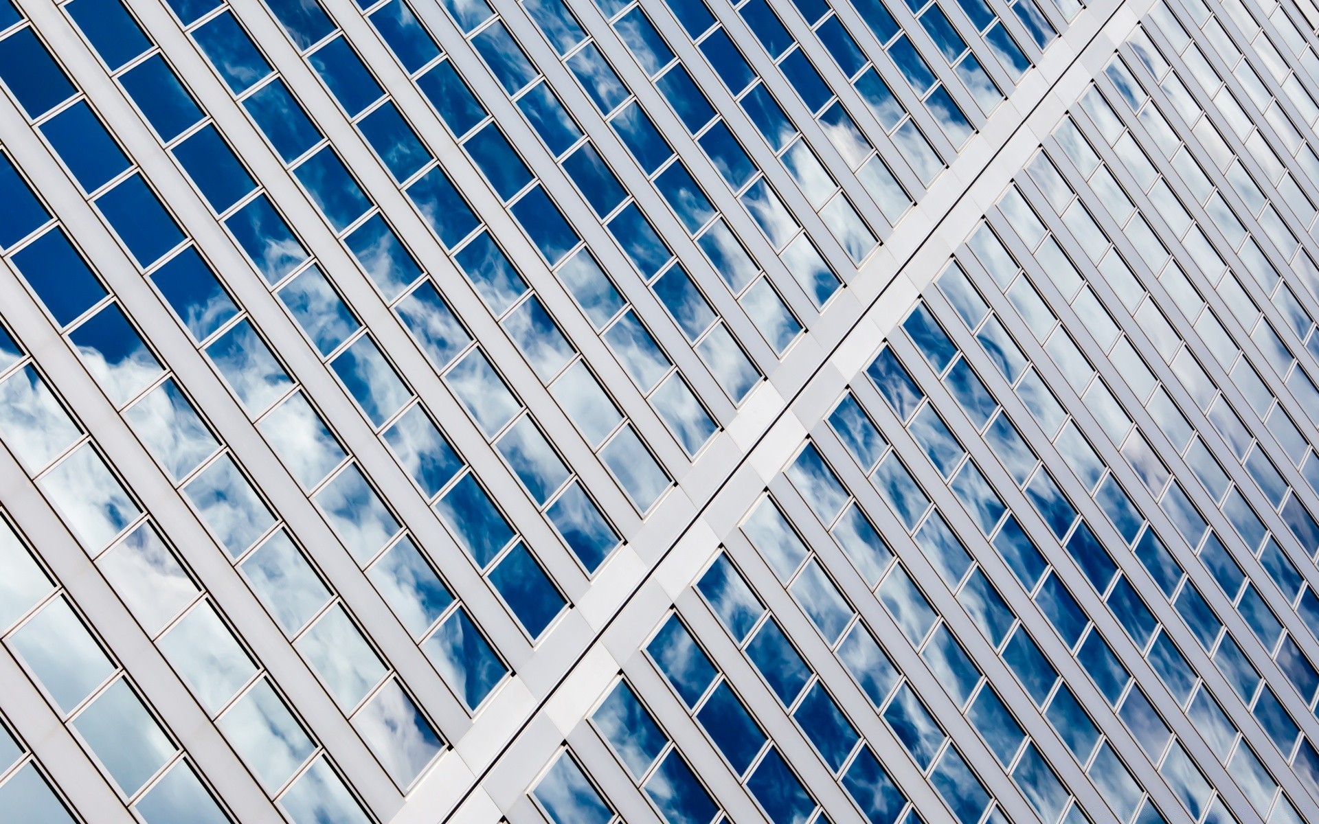Çok katlı bir binanın pencerelerinde gökyüzünün pitoresk yansıması