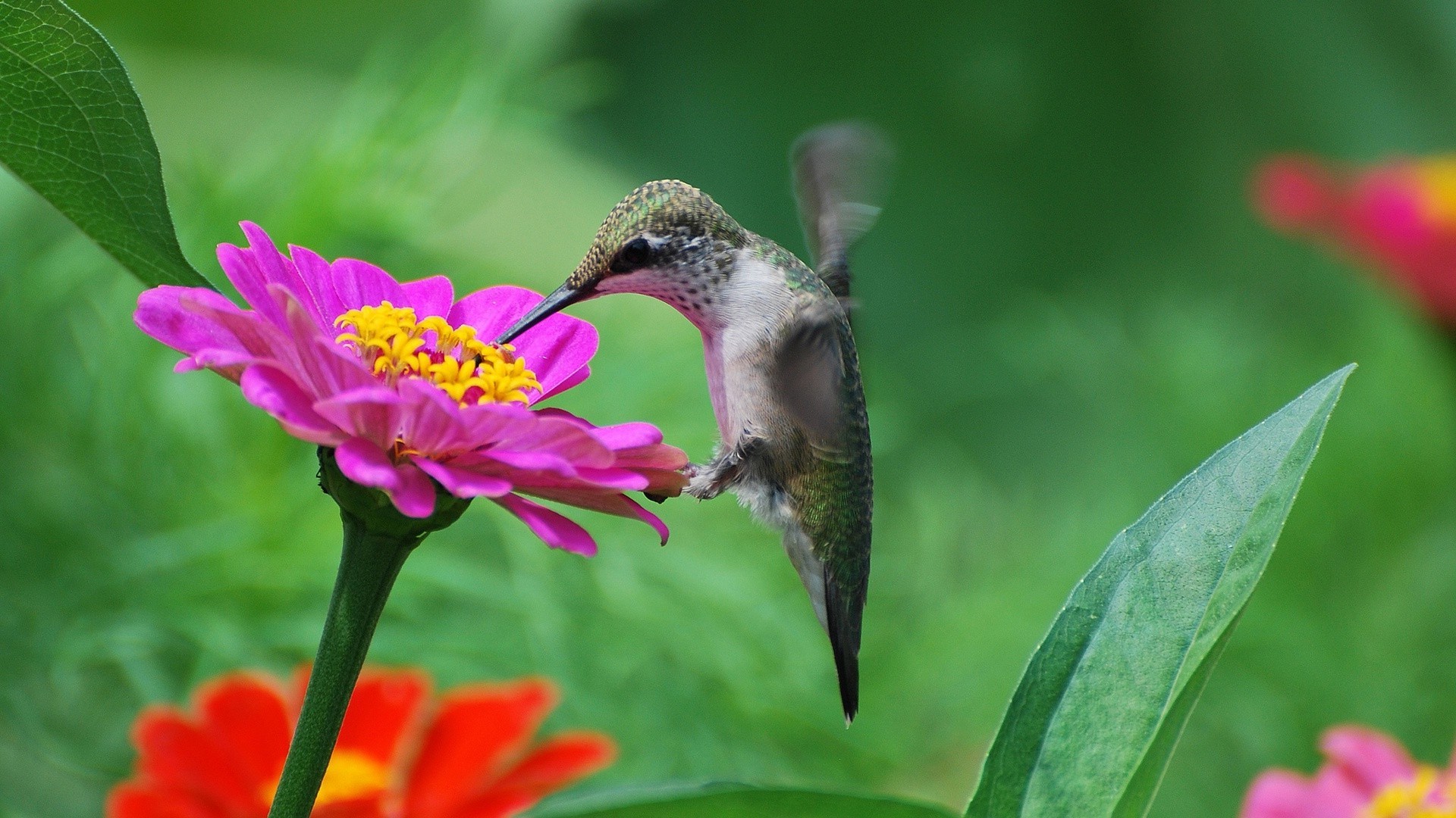 Küçük sinek kuşu pembe çiçekten nektarı toplar