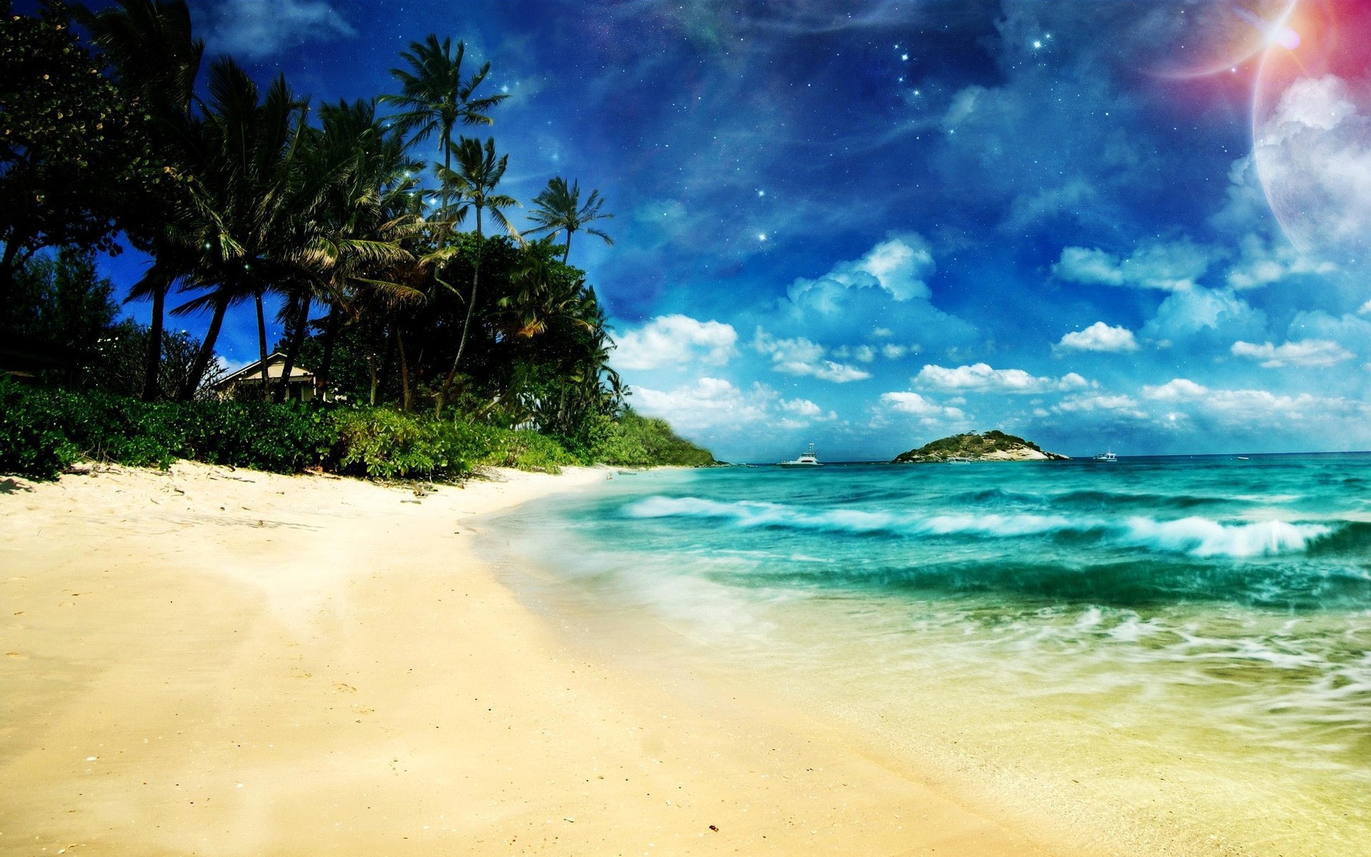 Plaj, gökyüzü, deniz ve palmiye ağaçları, romantizm