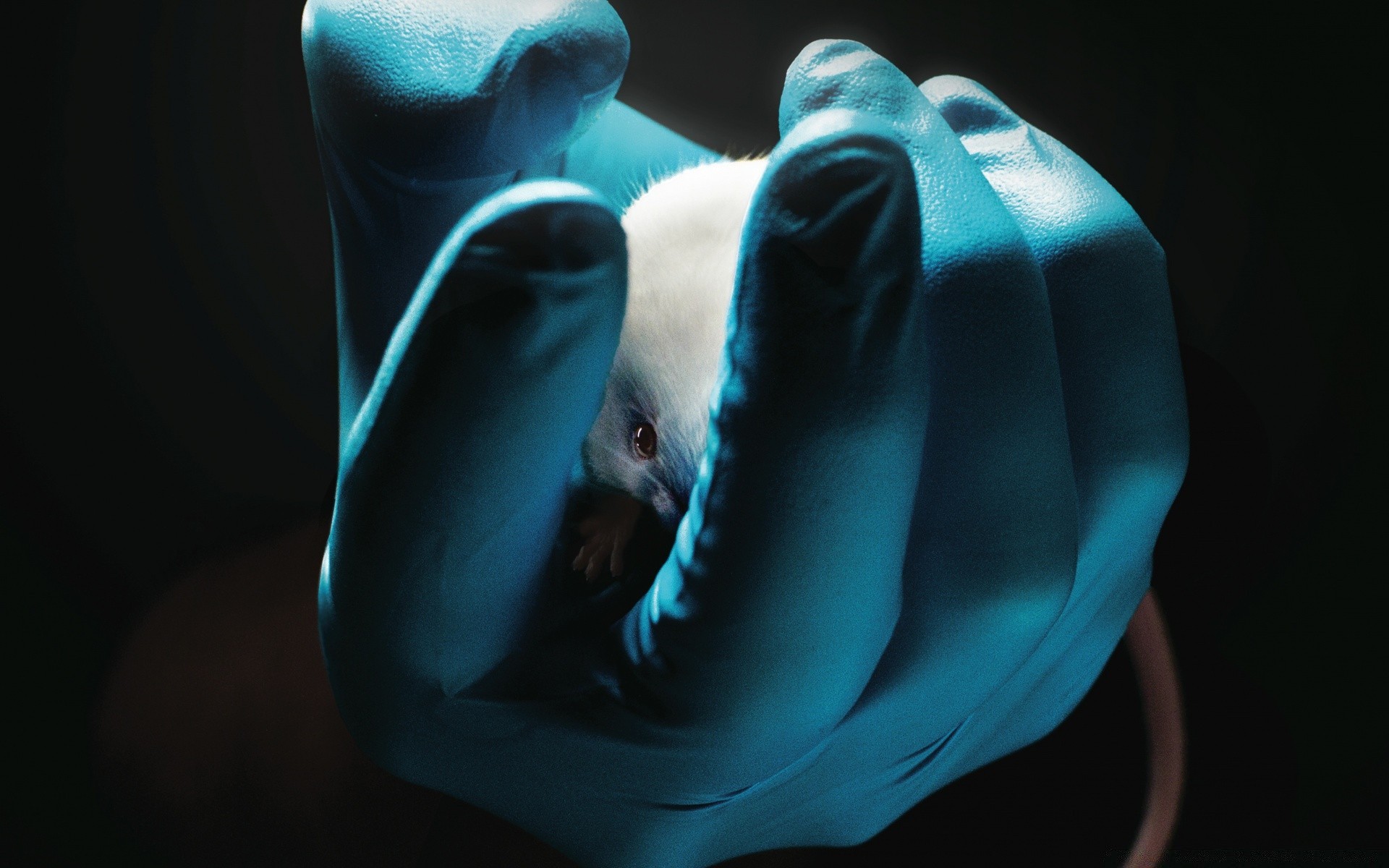 Karanlık bir arka plan üzerinde lastik eldivenli el