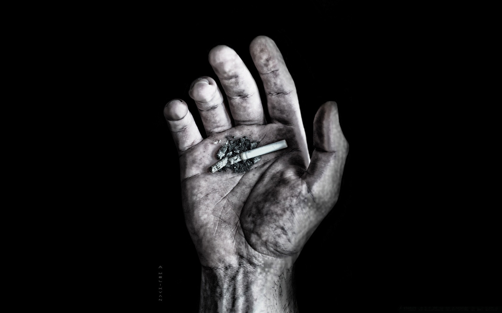 Siyah bir zemine karşı bir el ve çürümüş bir sigara