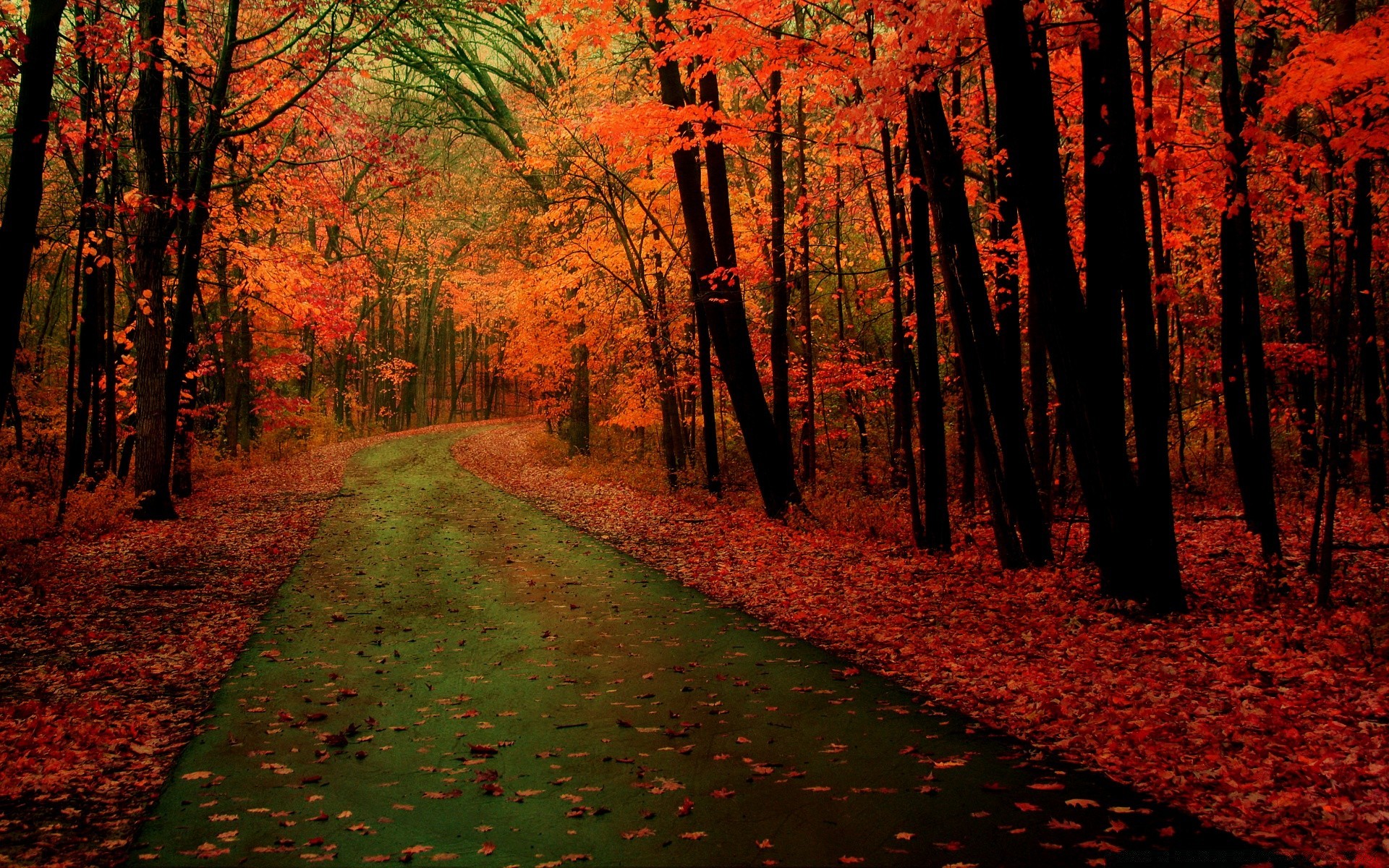 Yere kırmızı yaprakları olan sonbahar sokağı