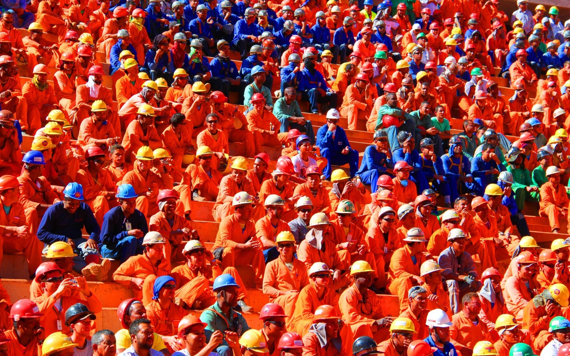 Renkli üniformalı kıyafetler giyen işçiler oturuyorlar