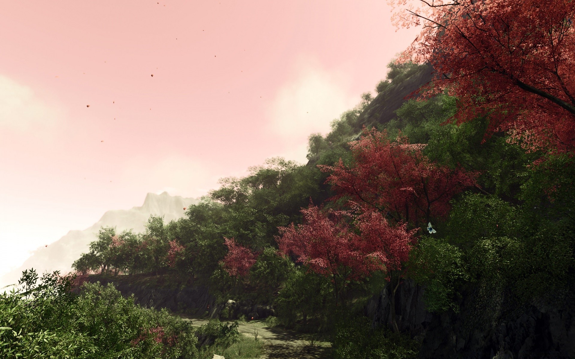 Gölgede iki ağaç arasında gizlenen bir ay ile olağandışı güzellikte bir manzara