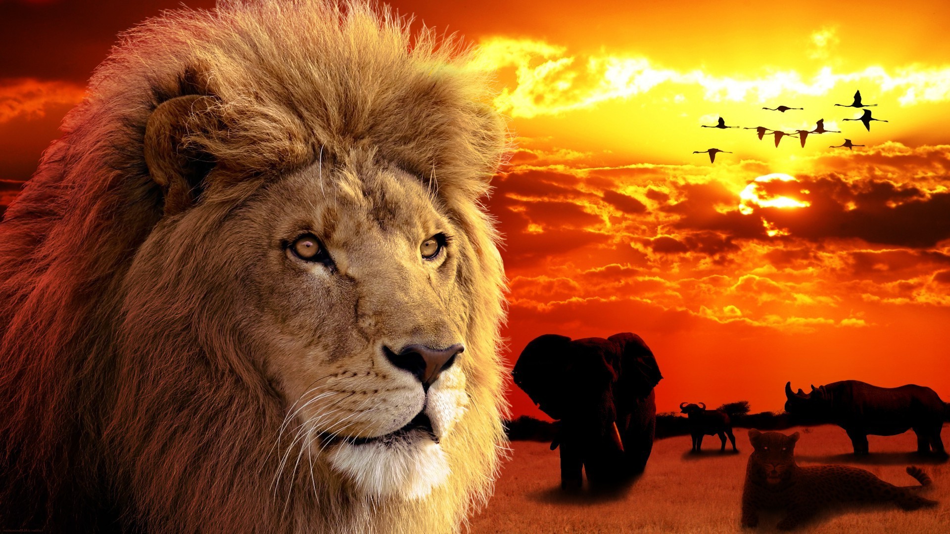 Aslan fillerin ve gergedanların arka planına karşı gururludur