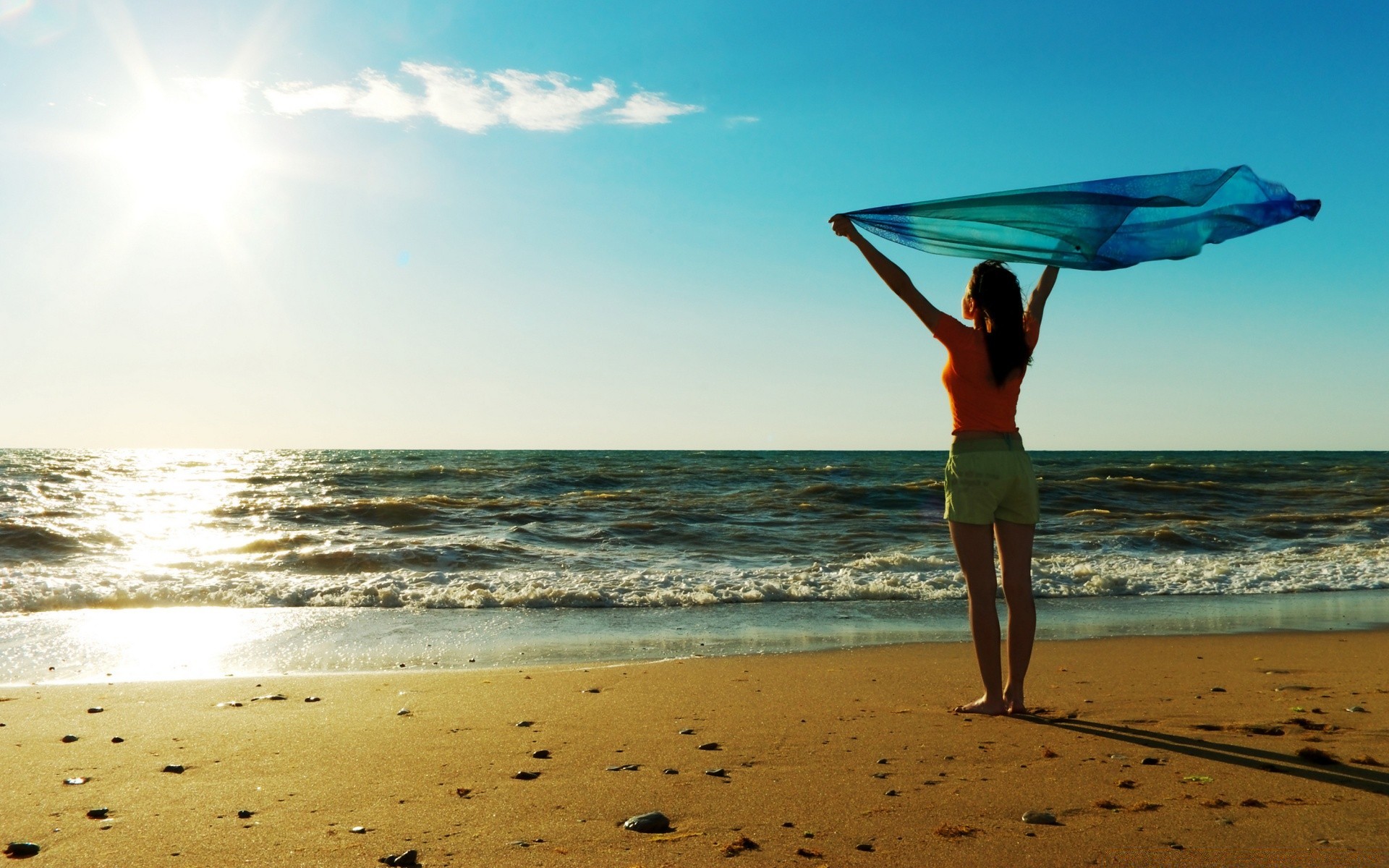 Sahilde pareo'lu kız. Sarı kum ve gün doğumu