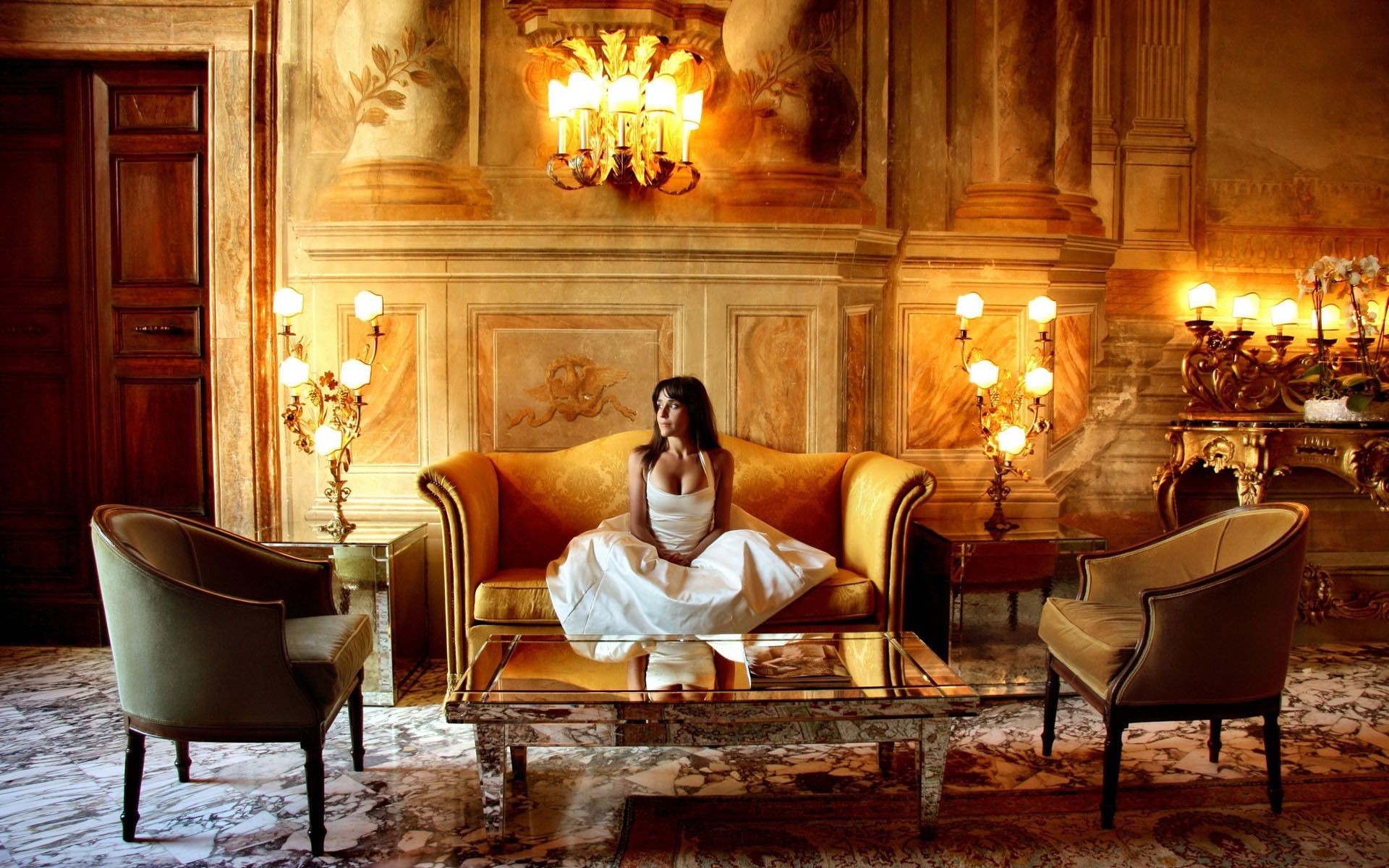 Esmer, ışıklarla çevrili bir kalede kanepede oturuyor