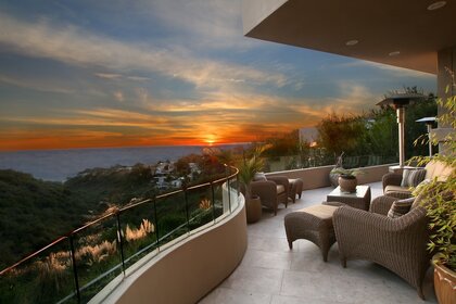 Plaj ve gün batımının arka planında masa ve sandalyeler