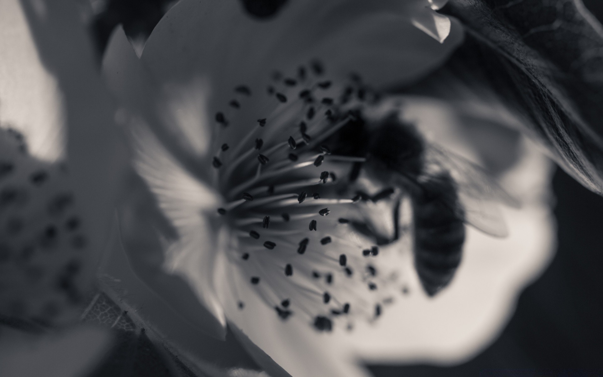 Arı çiçek tozlaşıyor bulanık siyah beyaz