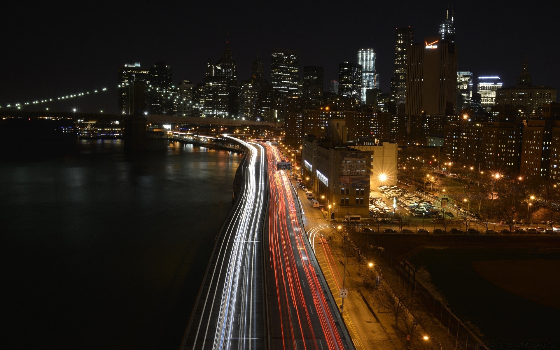 Otoyolun arka planında gece kasabasının cazip ışıkları