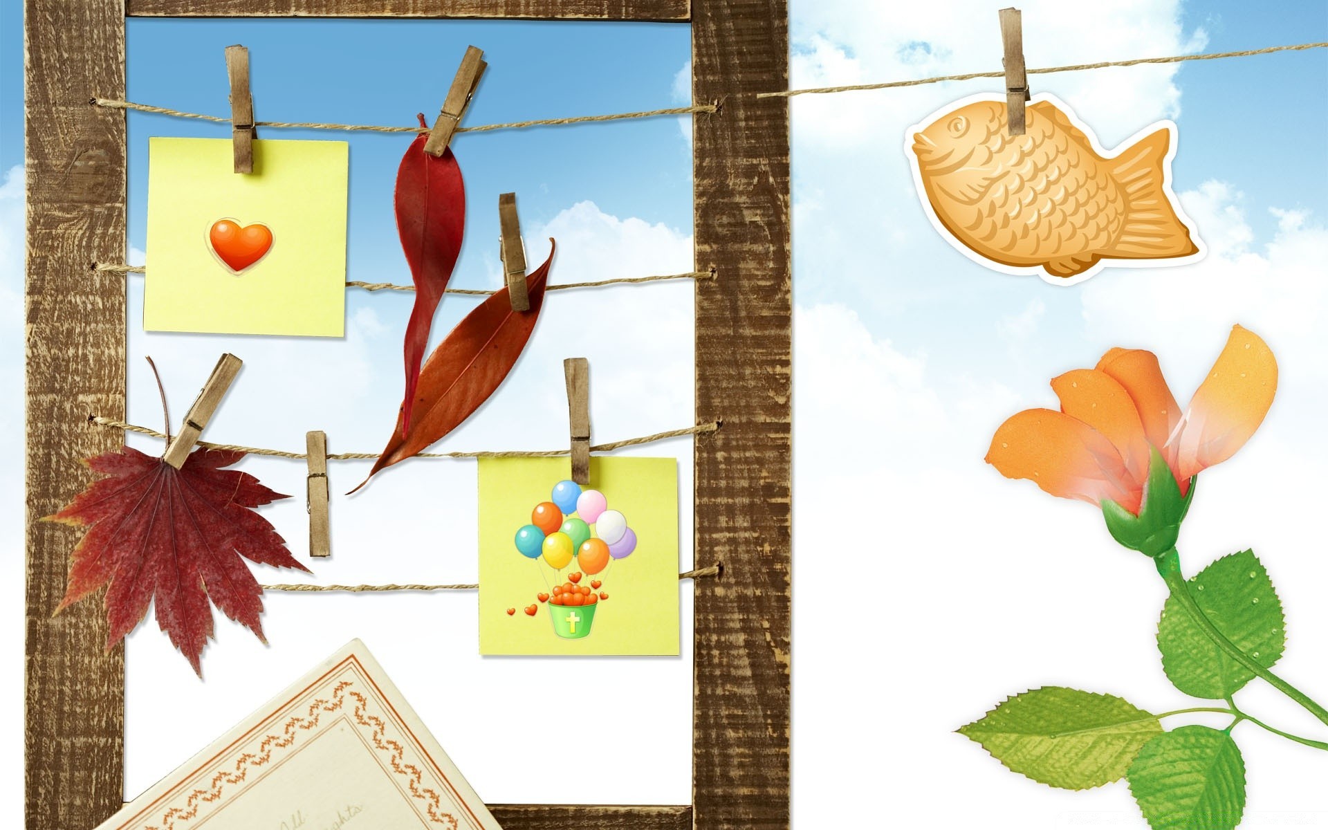 Sonbahar yaprakları ve iplere tutturulmuş clothespins ile çizimler