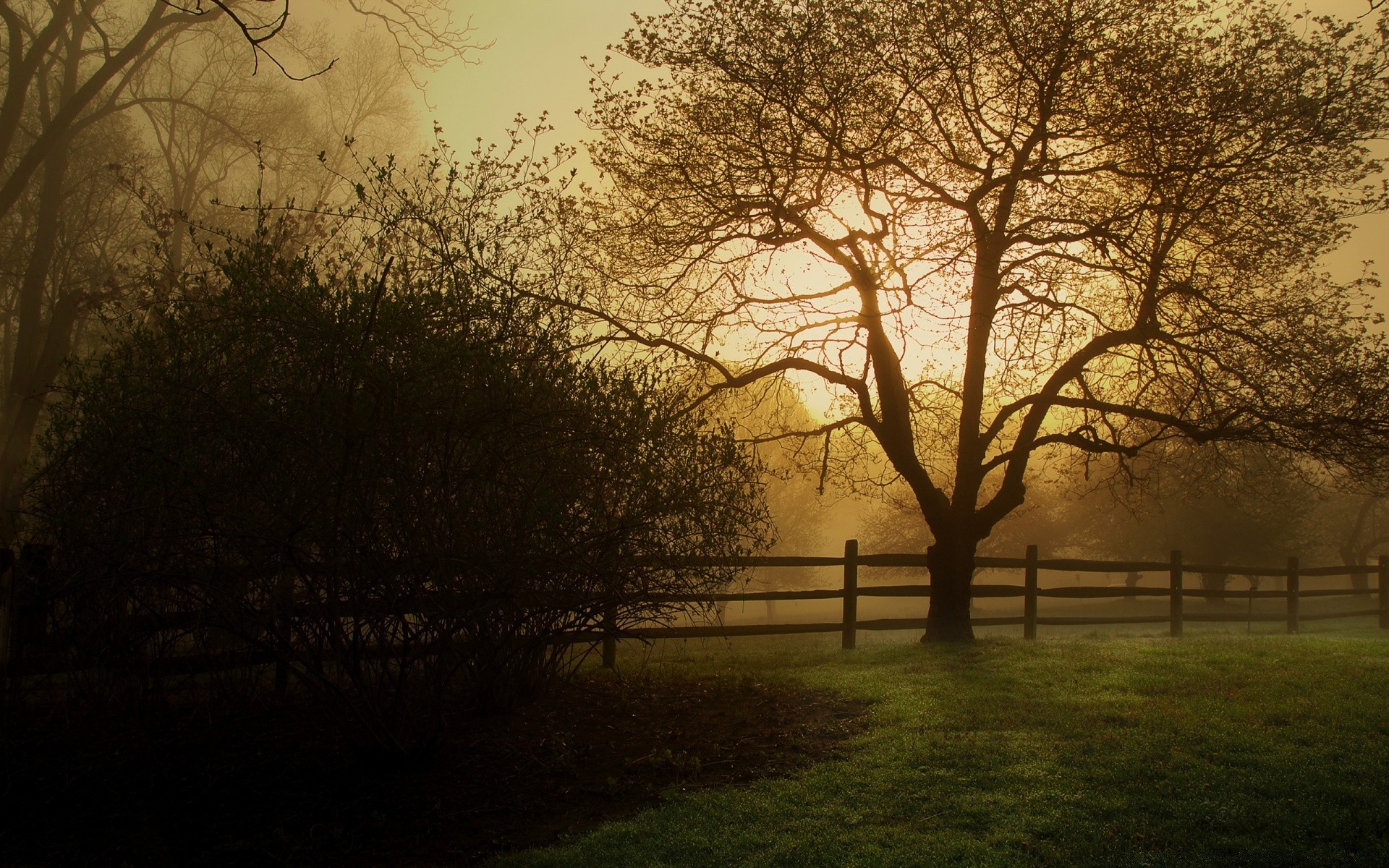 Sonbahar ormanında düşmüş yapraklarla şafak vakti