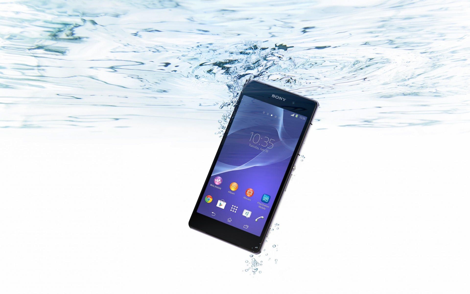 Şeffaf suda sonya'nın dokunmatik telefonu