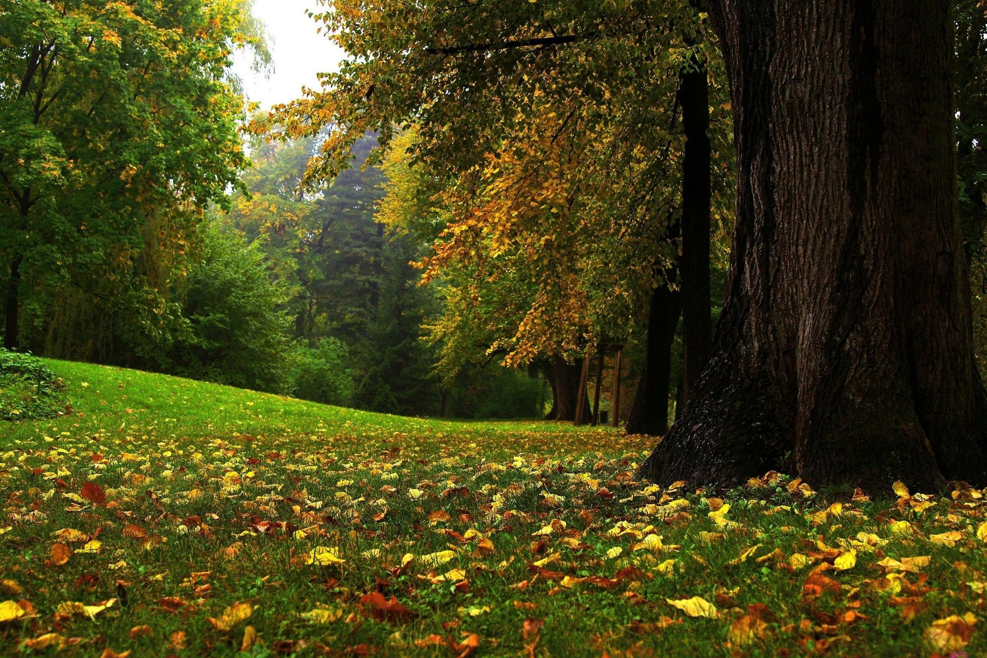 Parkta ağaçlardan düşen yapraklar