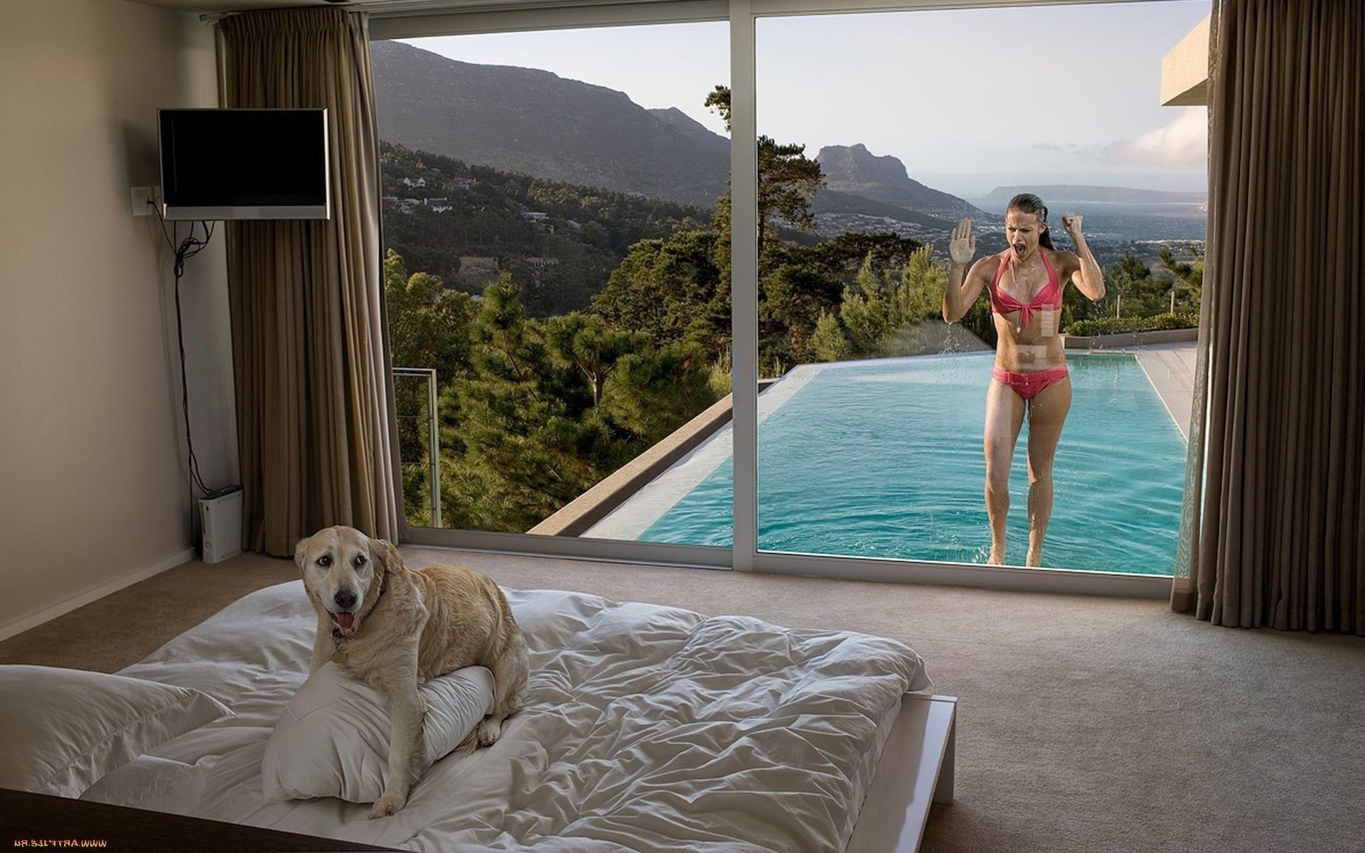 Yatak odasındaki odadaki köpekve bundan hoşlanmayan bir kız