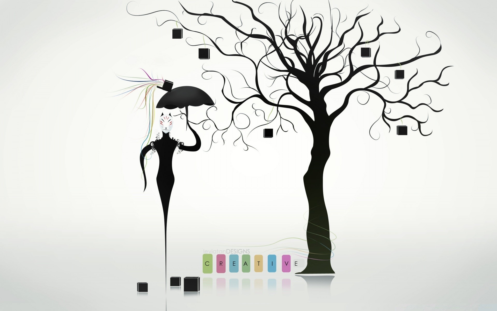 Küçük adamın ve ağacın beyaz bir arka plana karşı soyutlanması