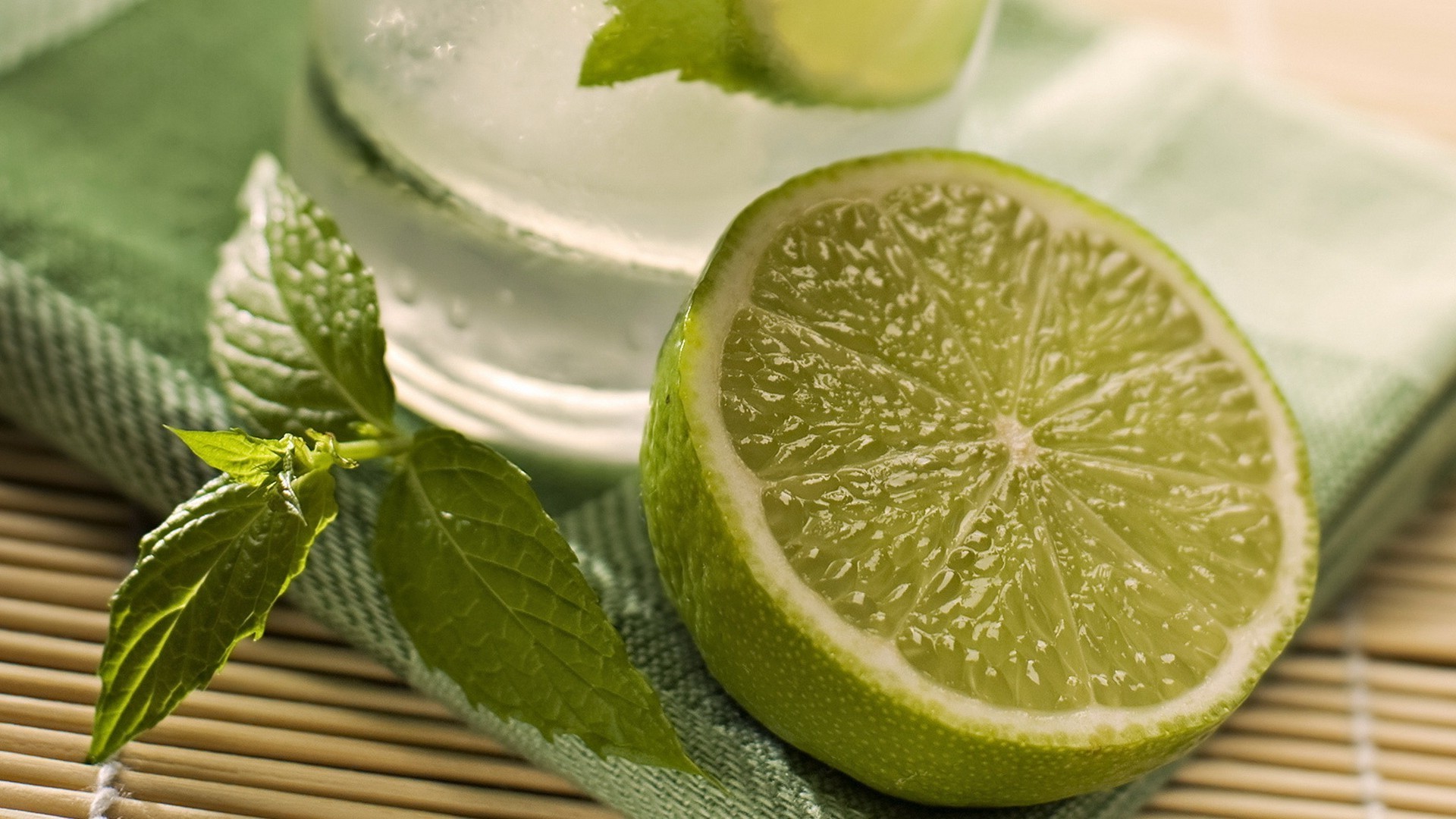Yeşil bir mendilin üzerinde nane yaprakları ve kireç