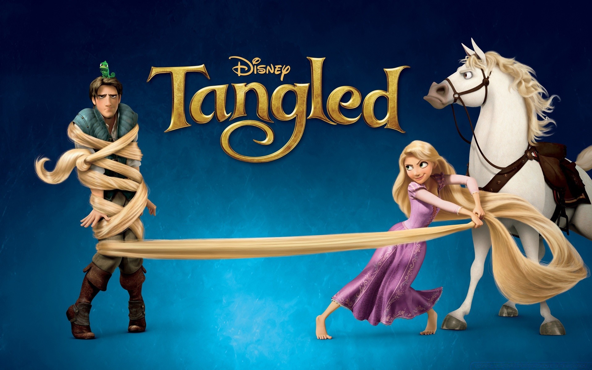 Çimenlerin üzerinde bir atın görüntüsü olan rapunzel karikatüründen bir resim