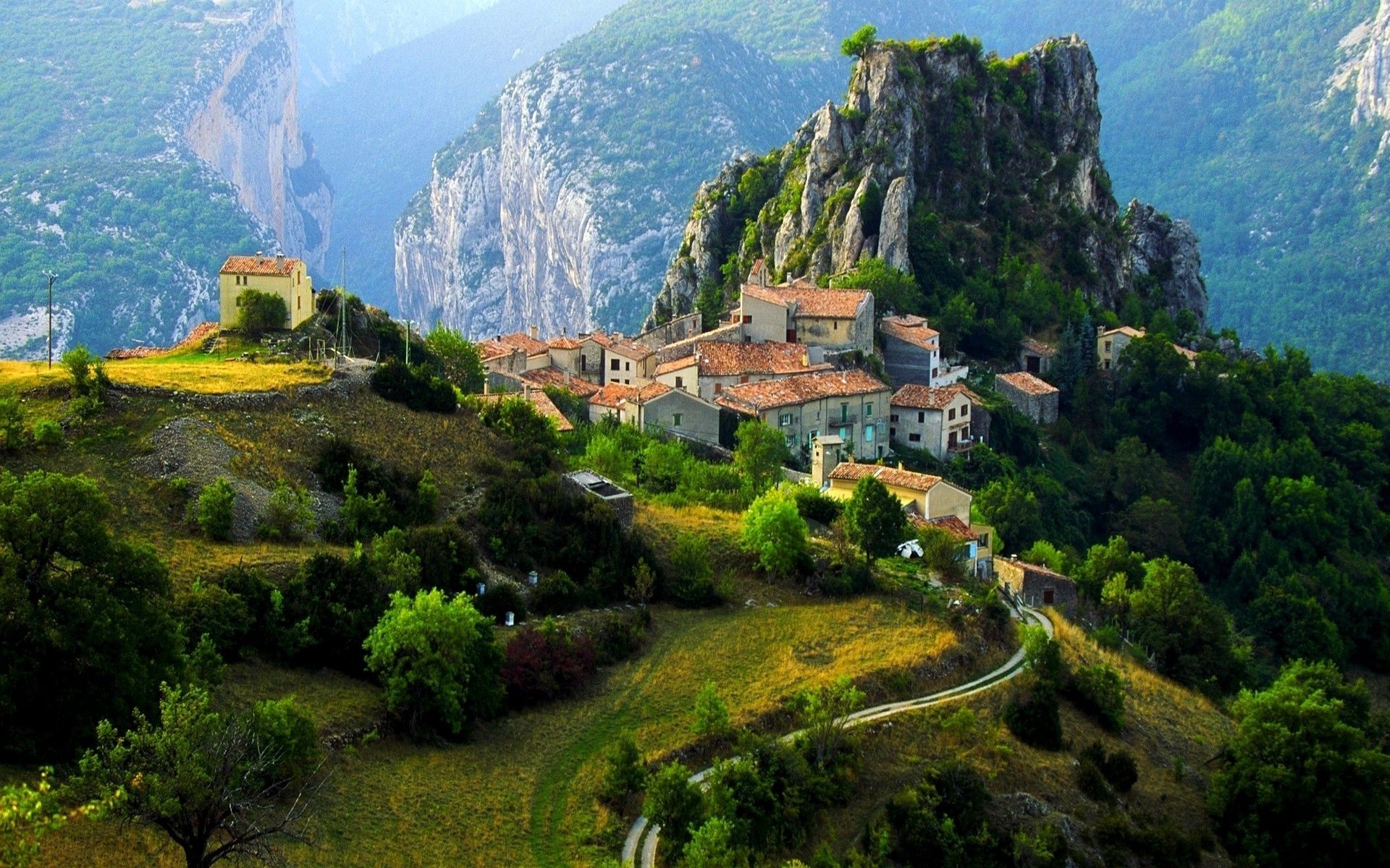 Yeşil dağlar ve küçük bir yerleşim yeri