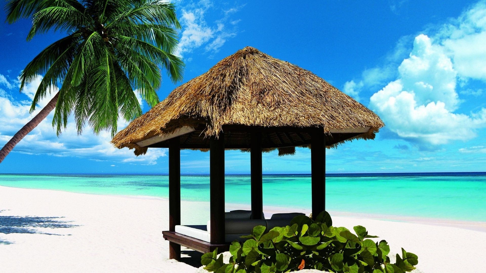 Tekne tropik bir adada palmiye ağaçlarının yakınında demirlediTekne tropik bir adada palmiye ağaçlarının yakınında demirledi
