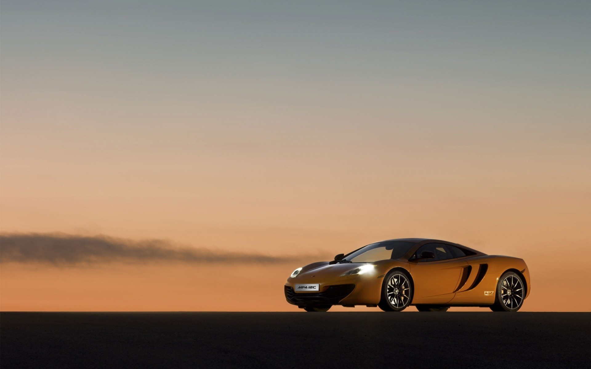 Turuncu-mavi gökyüzünün arka planına karşı sarı araba
