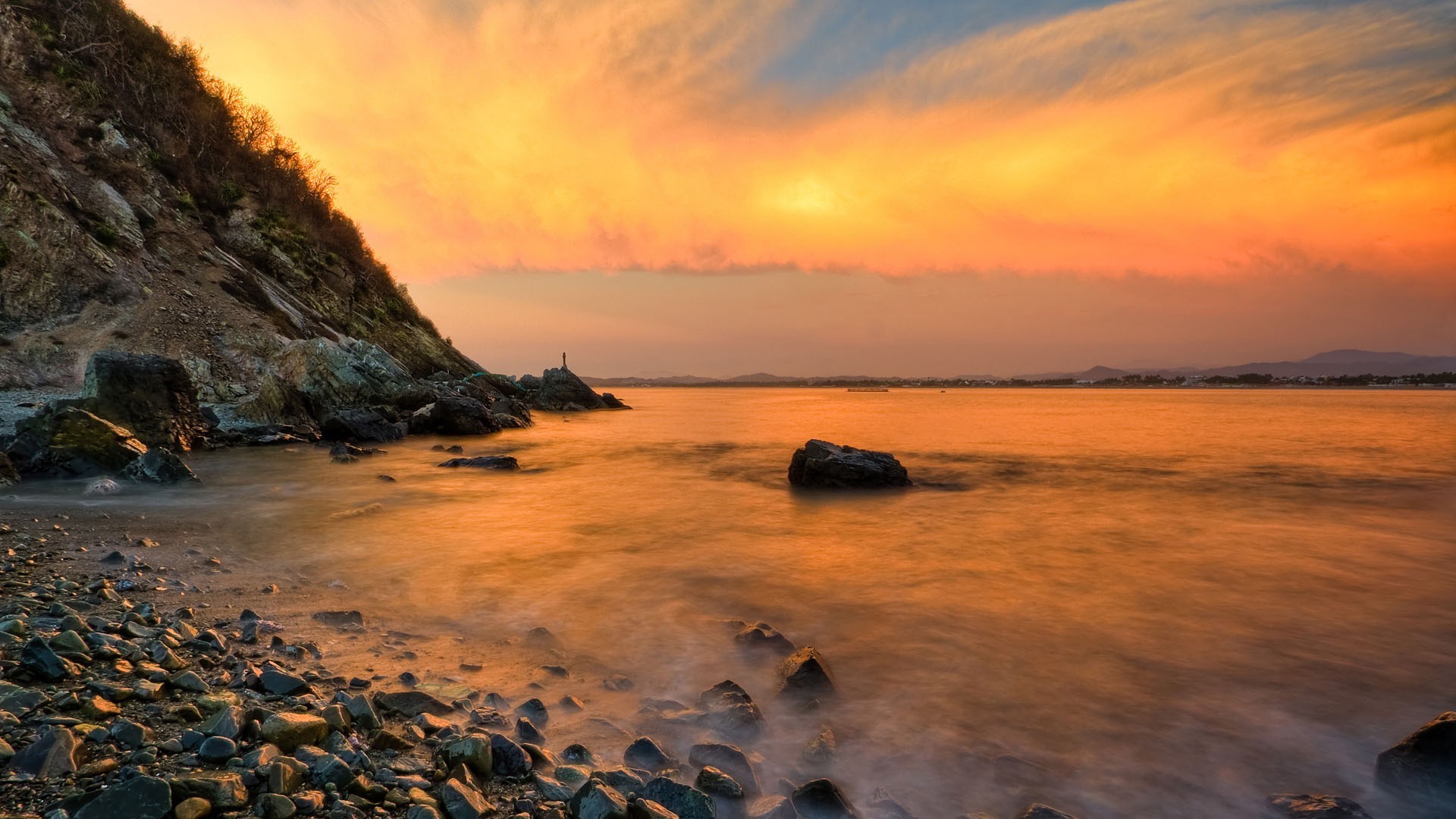 Kayalık deniz kıyısında turuncu gün batımı