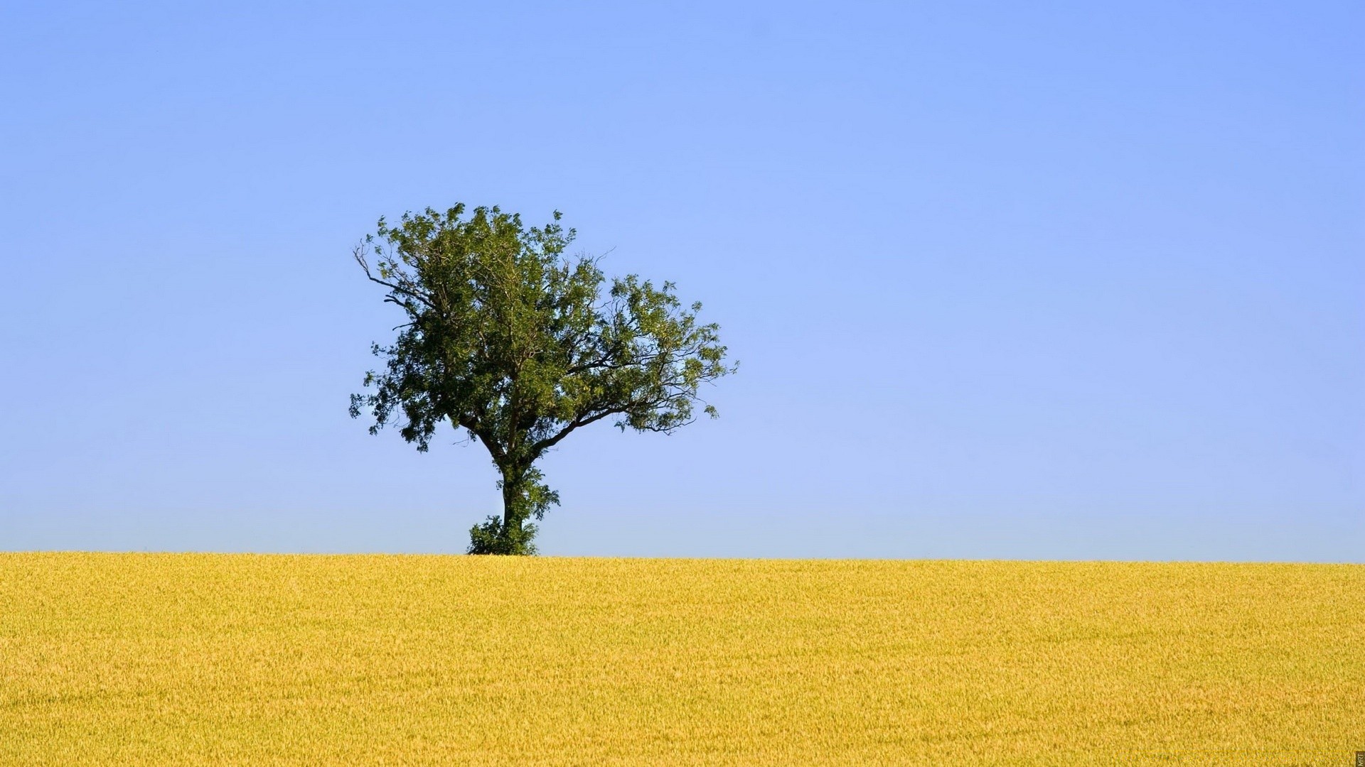 Mavi gökyüzünün altında sarı bir alanda bir ağaçla manzara