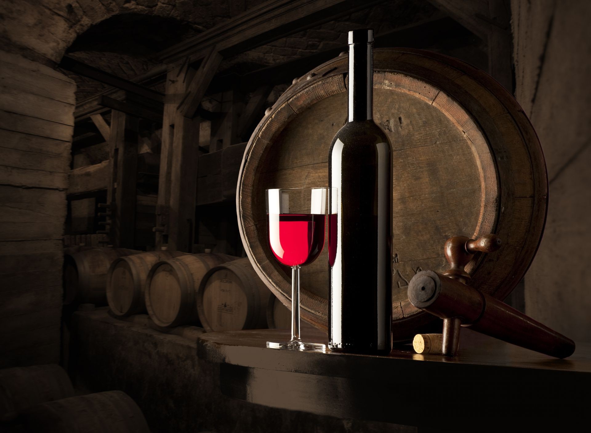 Arka planda bodrumda bir kadeh şarap ile şarap