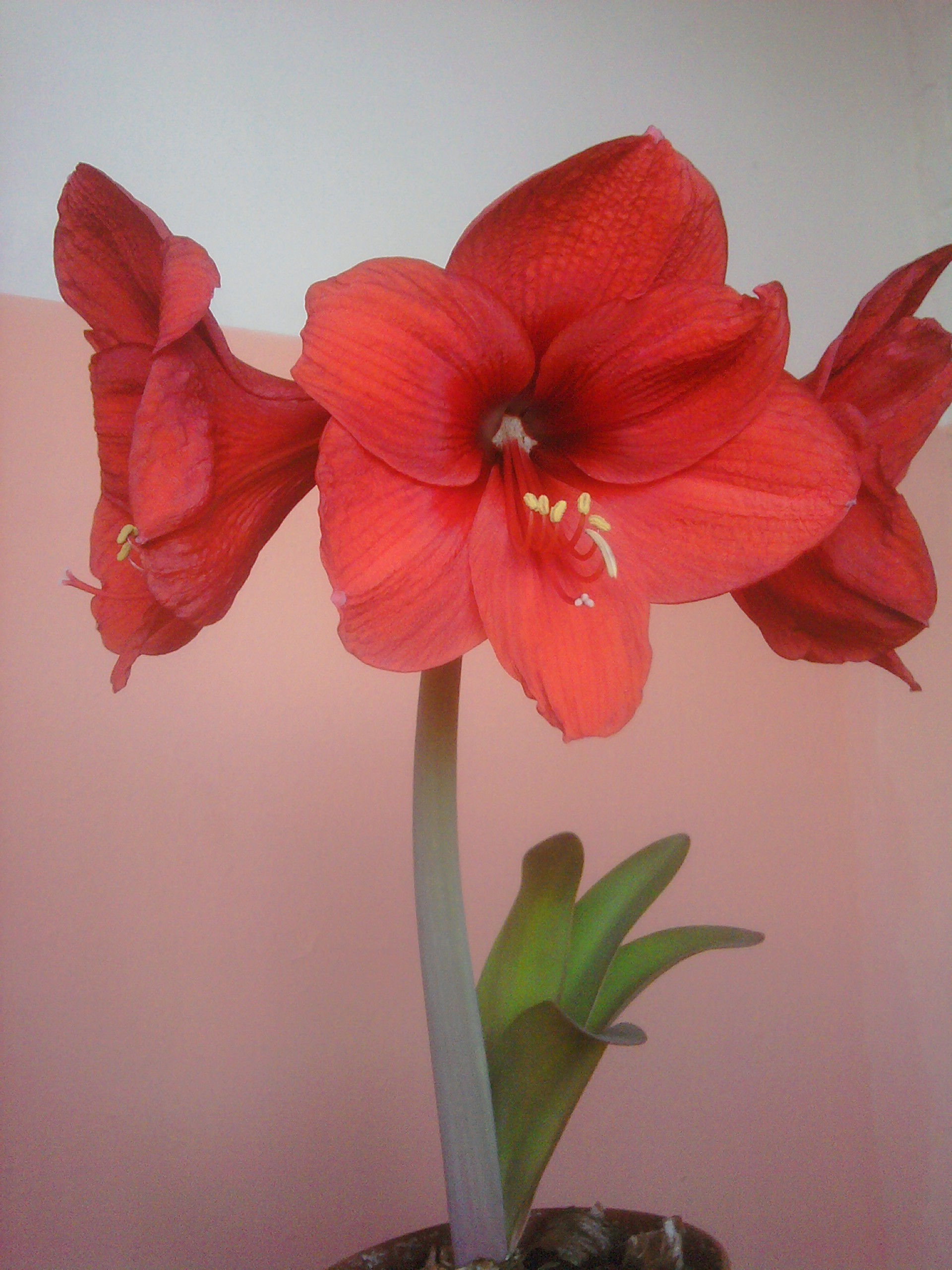 Şeftali arka plan üzerinde bir tencerede kırmızı çiçek