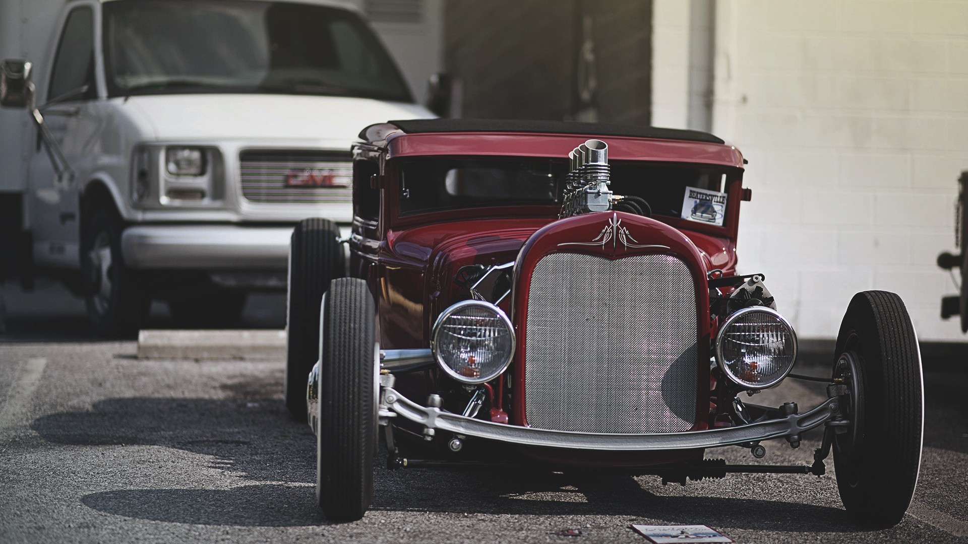 Fotoğraftaki kırmızı retro araba yaşlı bir tarzda