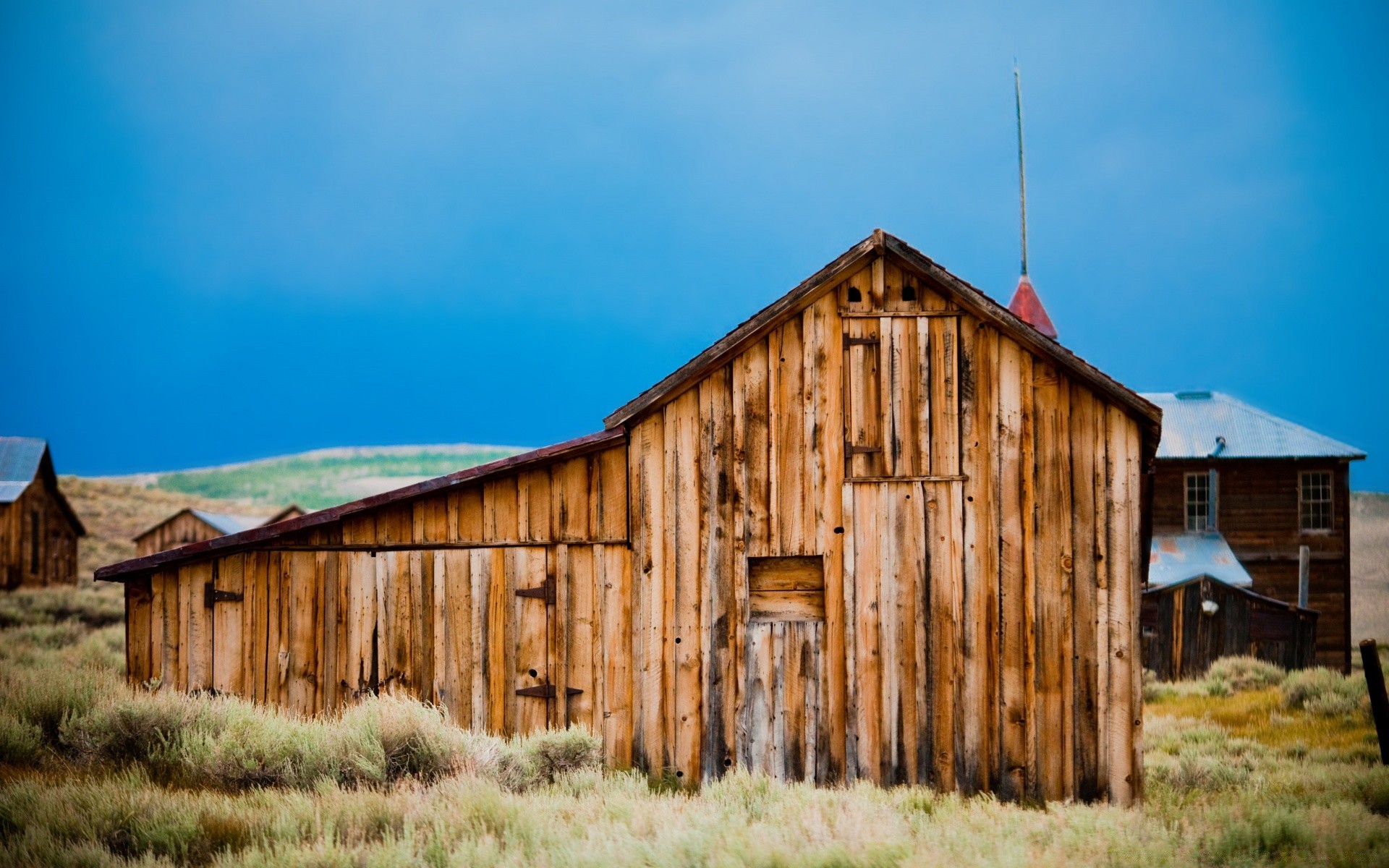 Yeşil bir tarlada ahşap bir ahır