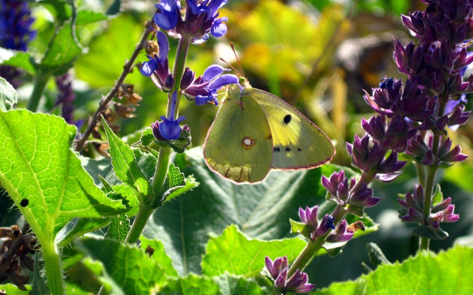 Mor çiçekli bir sap üzerinde yeşil kelebek