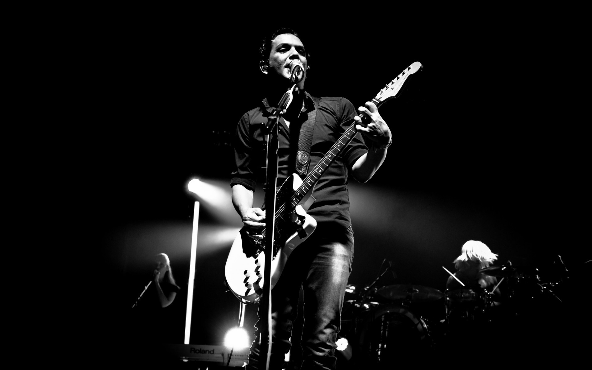 Amplifikatörün yanındaki ahşap zeminde yatan elektro gitar