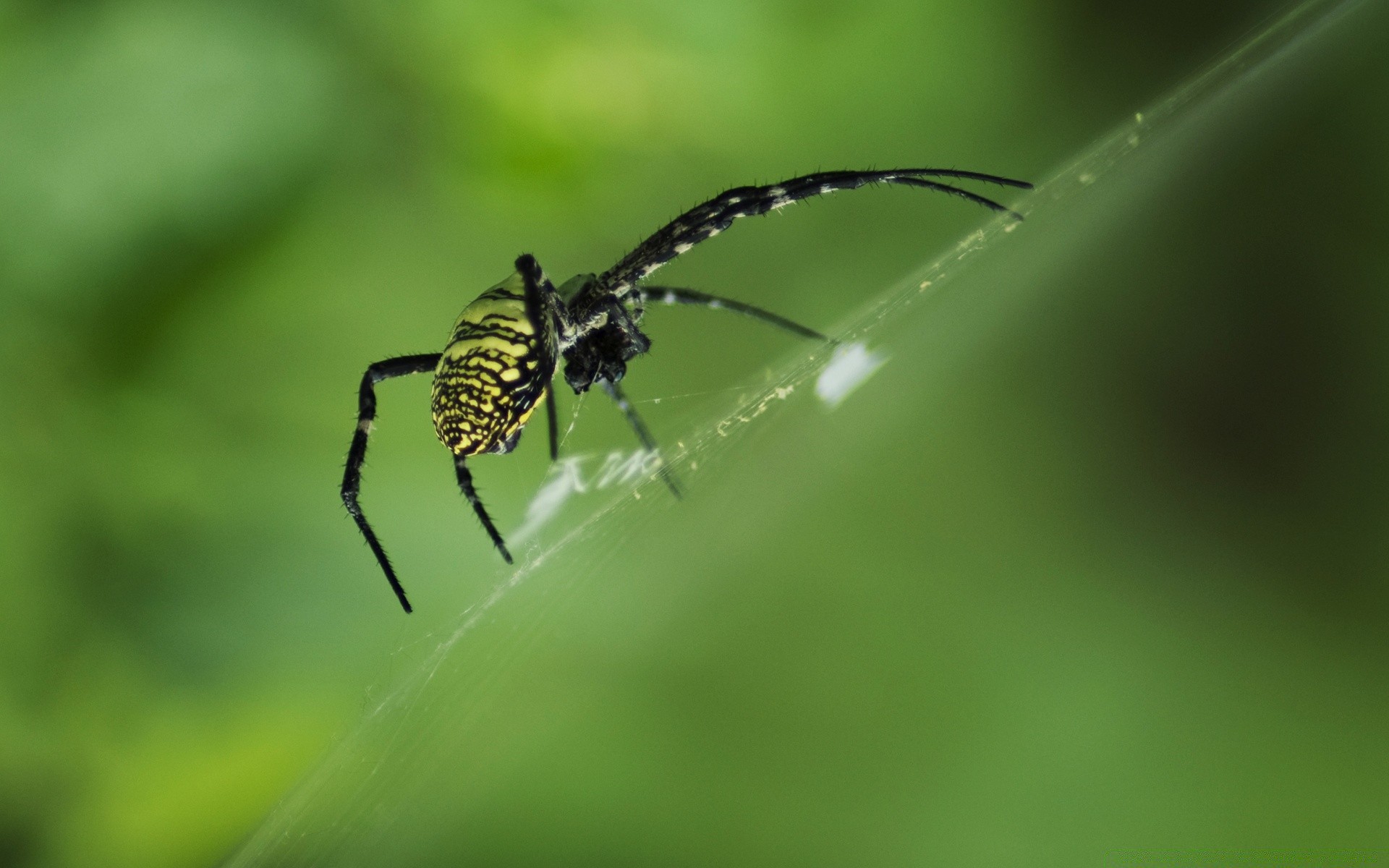 Yeşilliklerin arka planına karşı bir web üzerinde duran sarı-siyah bir örümcek