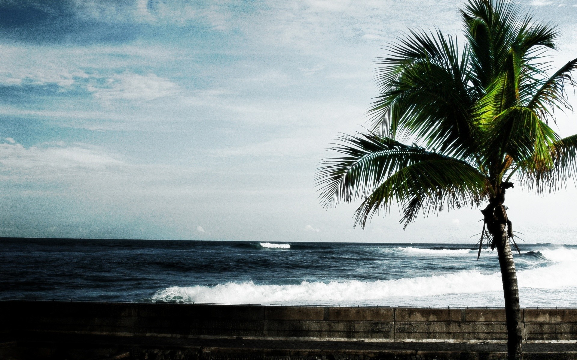 Sahilde bir palmiye ağacı okyanusun yanında duruyor