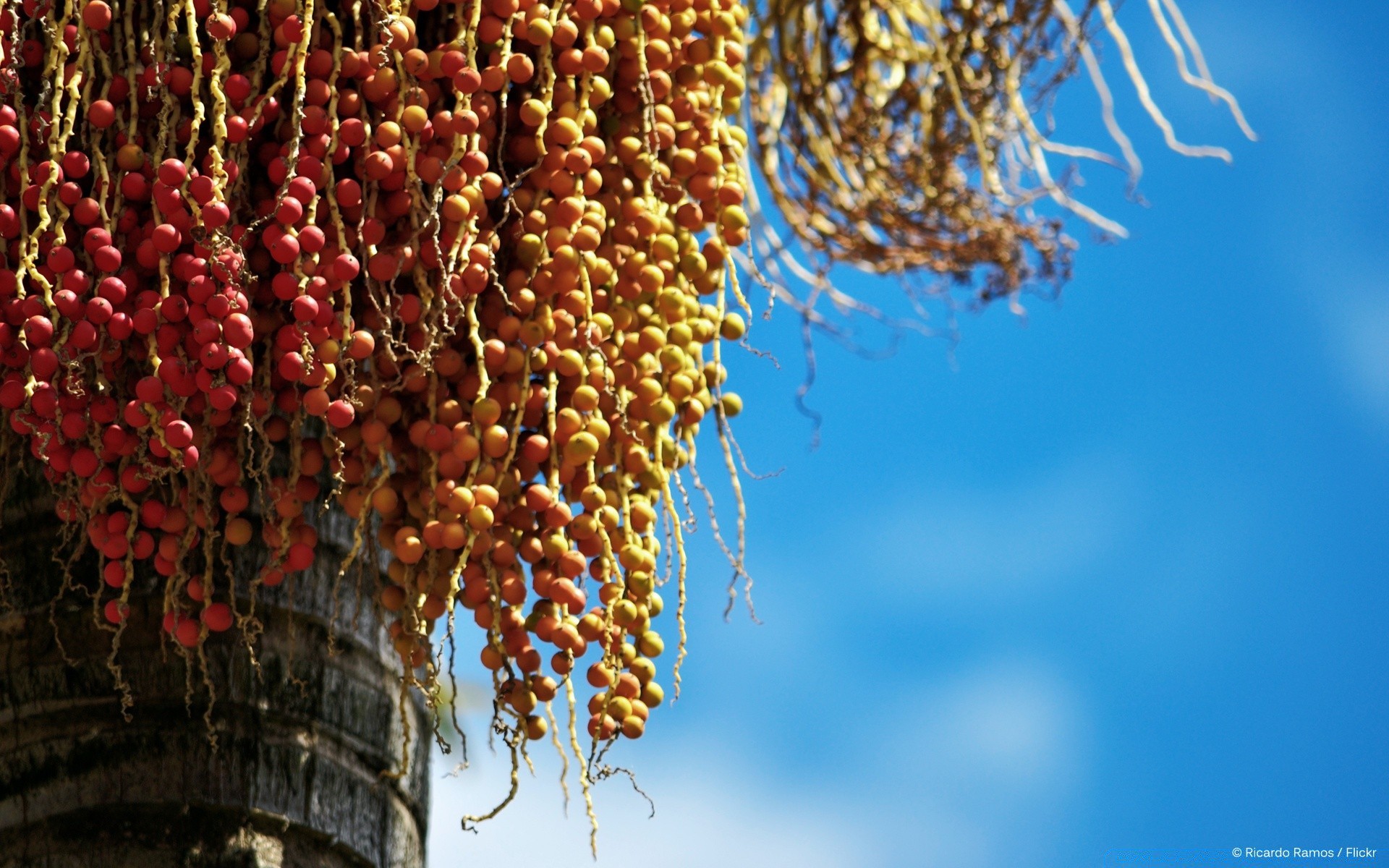 Meyvelerin meyveleri gökyüzünün arka planına karşı dallara asılırMeyvelerin meyveleri gökyüzünün arka planına karşı dallara asılır