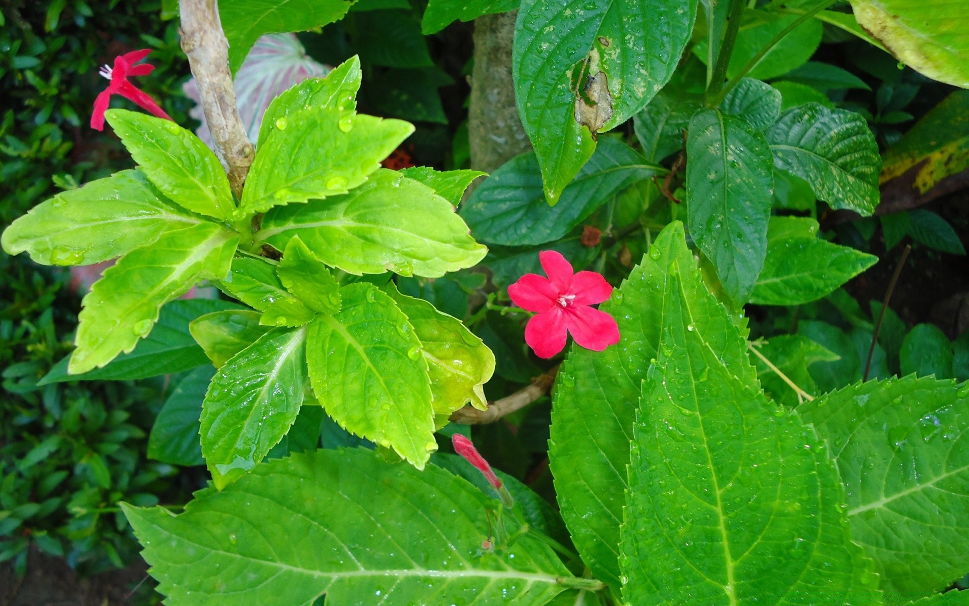 Yeşilliklerin sulu sulu yaprakları ile kırmızı bir çiçek