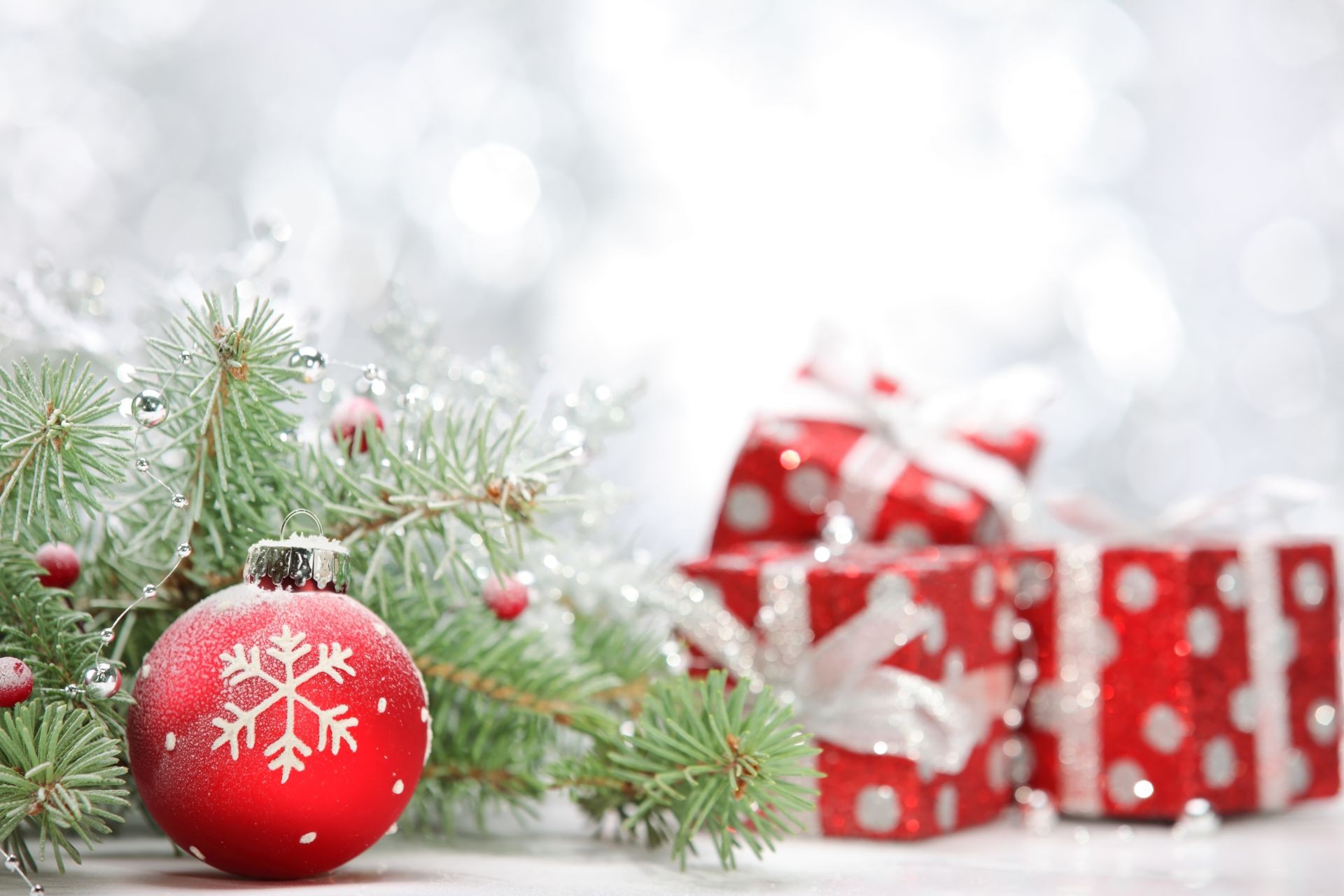Köknar ağacının dalında kurdeleli Yeni Yıl topu