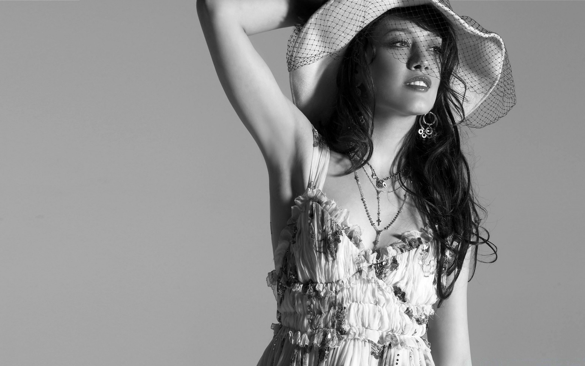 Gri bir arka plana karşı şapka ve elbiseli esmer