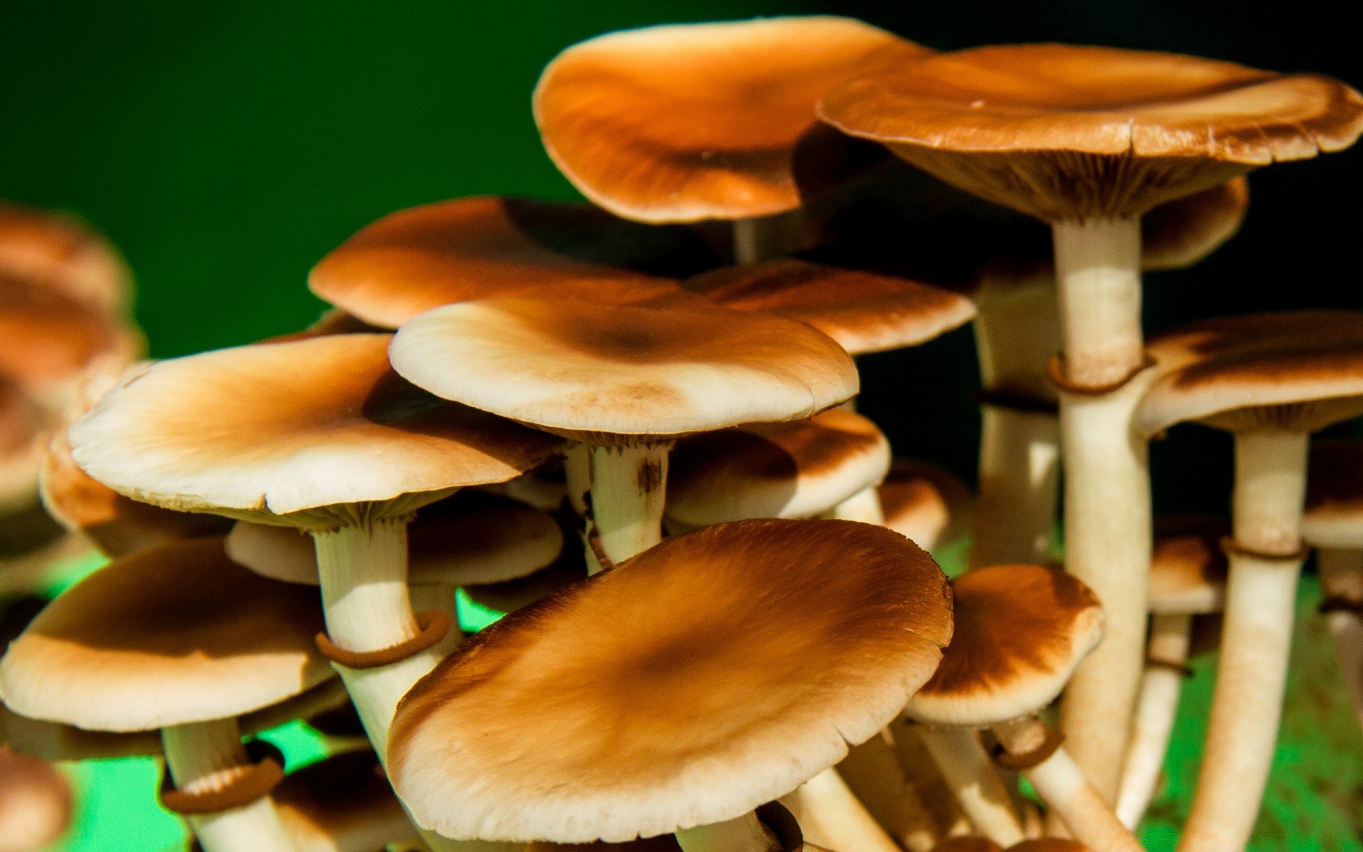 Çiğ çürümüş gövdedeki yosun ve mantarlar